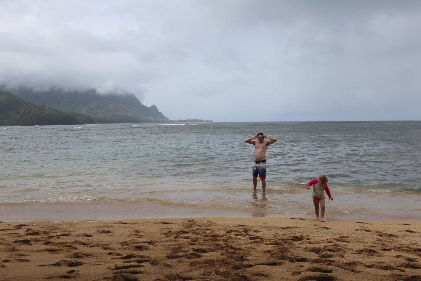 Up until now, Kauai, in our eyes, has been about 85 degrees, humid and sunny. Today it showed why the north has so much green jungle. It poured, off and on all day. Last night we went out for a walk along the beach, leaving the double stroller by the pool...bad idea. It sprinkled, we turned around, then it rained, then it poured all in a matter of 5 minutes from sunny. OOPS my stroller got soaked, Andrew enjoyed his first pour and Addie kept on playing in the ocean. Today we were wiser. I brought only towel and everyone in swim suits. So, if we got wet, who cares? It's freaken hot. I laid out a towel and when it poured, I hunkered under an unbrella with Andrew until it passed. Once we figured that out we had a full day of beach and pool. We also went and saw Kilauea Lighthouse, grabbed dinner at the Kilauea Fish Market and watched the sunset.